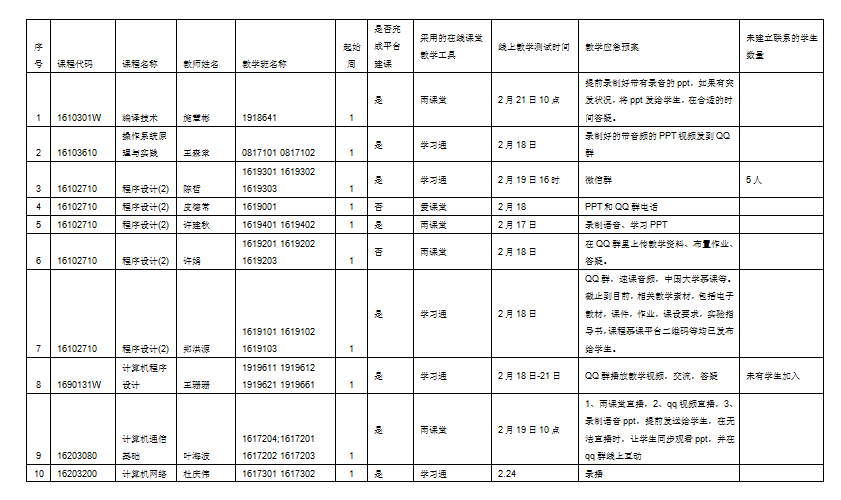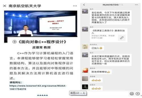 停学”的要求,学院及时制定了《2020年春季学期疫情防控期间教学工作实施方案》和《2020年春季学期疫情防控期间本科教学工作手册》,统筹安排教学计划,灵活采用线上授课形式。学院皮德常教授在爱课程(中国大学MOOC)平台上向高校和社会公众开放国家精品在线课程《面向对象C++程序设计》。学院以学生为中心,对照春季学期开设的72门次教学课程,一一建立QQ或微信群,覆盖全体上课学生;研究生教学工作全面转战线上指导,引导学生完成了线上选课,实现了论文在线盲审,各导师通过视频会议系统召开每周组会,进行线上指导;积极协助支持线上教学准备工作,邀请陈丹老师分享线上教学经验,帮助任课教师通过在线平台资源搭建网络课程,并协调解决设备、平台、课程等问题,为课程实施提供全方位保障;对线上教学准备工作、师生在线教学条件进行了细致摸排,并同步制定了应急教学预案,进行了多轮线上测试,为新学期教学工作做好充分准备。