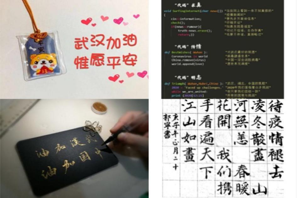 学院积极引导学生在疫情中弘扬正气、传递正能量,涌现出了一批抗“疫”典型:“支持湖北在行动大学生团队”为疫区募得善款2万余元,全部用于购买医疗物资;算法协会面向大学生免费提供课程,并自发向武汉新冠专项捐款5000元;学生们还通过书法、海报、视频、三行代码等多种形式表达对湖北的祝福和鼓励;疫情期间,学院数据管理与知识工程“五好”导学团队的导师们还专门制作了温馨视频发给学生,鼓励学生们珍惜时间、努力科研、共克时艰。
