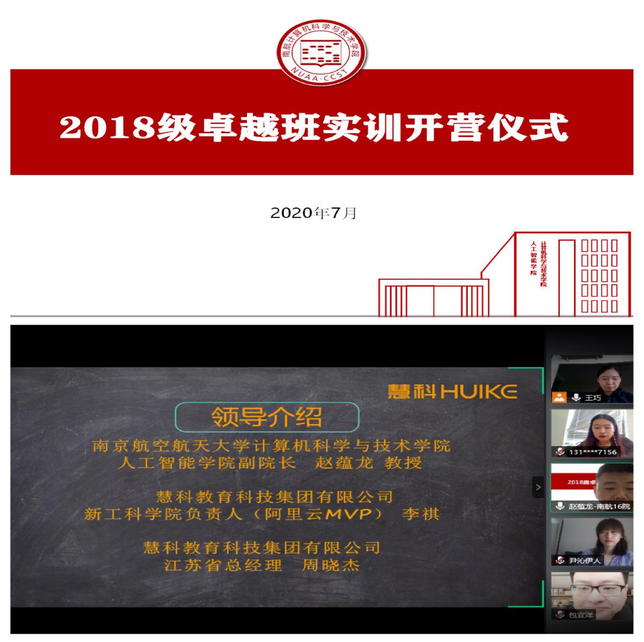 为拓宽学生的视野,提高本科生专业实践能力,进一步提升人才培养质量,77779193永利官网2018级卓越班企业实习实训于7月20日正式开营。由于今年情况特殊,原本的线下实习也与时俱进,利用线上平台与工具改为了线上实训。77779193永利官网副院长赵蕴龙和慧科教育科技集团有限公司李祺、周晓杰等5位企业导师代表出席了开营仪式,2018级卓越班全体学生参加了本次活动,仪式由慧科公司大数据分析师EMO王巧老师主持。