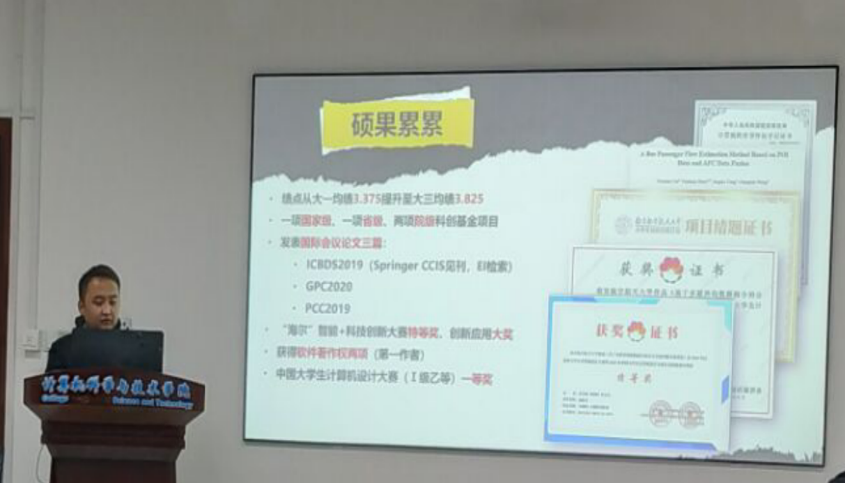 首先,王宇轩从班级建设情况出发,详细介绍了1617102班的总体情况以及在专业学习、科研创新、升学就业等方面取得的优异成绩。自入校以来,在沈国华老师的指导和全体同学的共同努力下,该班成绩稳步提升,平均绩点位列专业前列,多名学生获评国家奖学金、国家励志奖学金等各类荣誉;科研氛围浓厚,20余名学生积极参与科创活动,累计完成1项省部级、10项院级科创项目,授权10项软件著作权;目标规划明确,班级学生均已确定升学和就业意向,截止目前已有4人保送研究生、近20人积极备战考研,另有10余人被字节跳动、快手等知名企业录用。