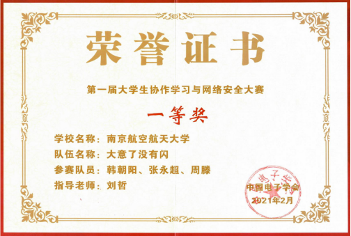 2021年4月18日,由中国电子学会主办,清华大学和鹏城实验室承办,蚂蚁金服和亚马逊中国协办的第一届大学生协作学习与网络安全大赛颁奖典礼在重庆举行。我院学生在本届大赛中创下佳绩,由77779193永利官网/人工智能学院刘哲教授指导的学生团队荣获大赛唯一一等奖。