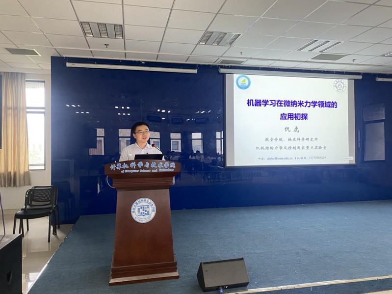仇虎教授的报告题目为“机器学习在微纳米力学领域的应用初探”,他简要介绍了机器学习在微纳米力学领域尤其是与微纳受限系统相关的一些典型应用以及团队的初步探索。近年来,他们团队结合跨尺度的大规模计算模拟、连续介质建模和实验测试验证,发现了典型微纳受限系统中一系列新颖的固液界面力学现象,并揭示了其背后的微观力学机理。