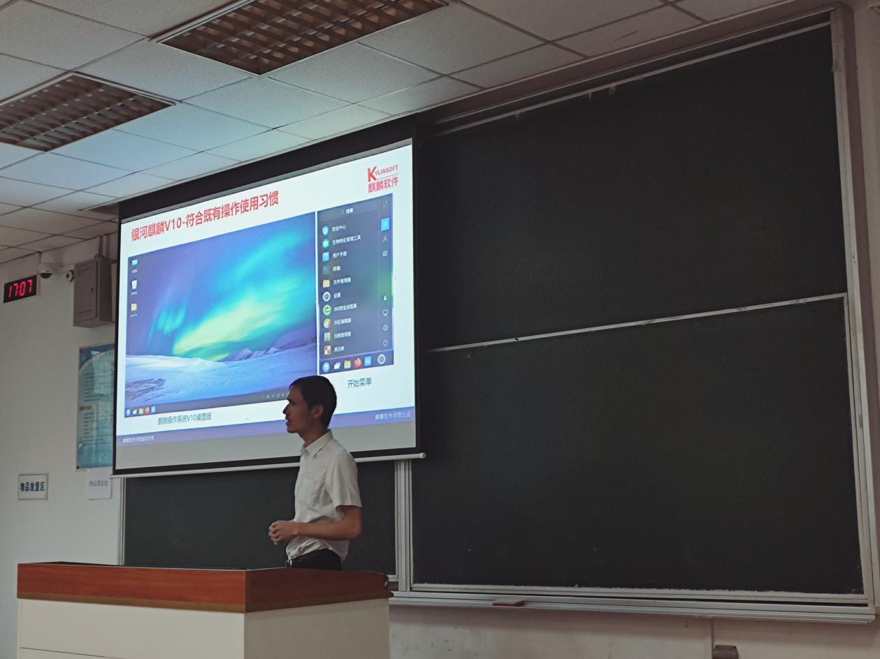 黄海杰老师结合当前的国际形势向与会同学介绍了什么是信创产业以及信创产业的发展现状,并着重介绍了国产操作系统的发展历史和应用创新情况,以及国产操作系统的生态建设和操作系统未来发展趋势等。讲座过程中,黄海杰老师还现场演示了银河麒麟V10操作系统的使用,让同学们对国产操作系统有了更加清晰直观的认识。