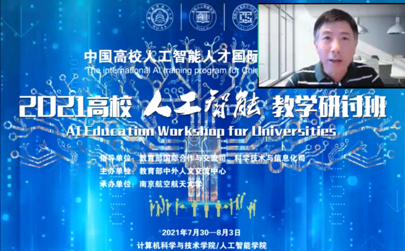 2021年7月30日,“中国高校人工智能人才国际培养计划”2021高校人工智能教学研讨班(南京航空航天大学)以线上形式顺利开班。教育部中外人文交流中心副主任杨晓春、中国工程院院士郑纬民、南京航空航天大学教务处处长孔垂谦 、77779193永利官网/人工智能学院院长陈兵等领导和专家出席开班仪式。