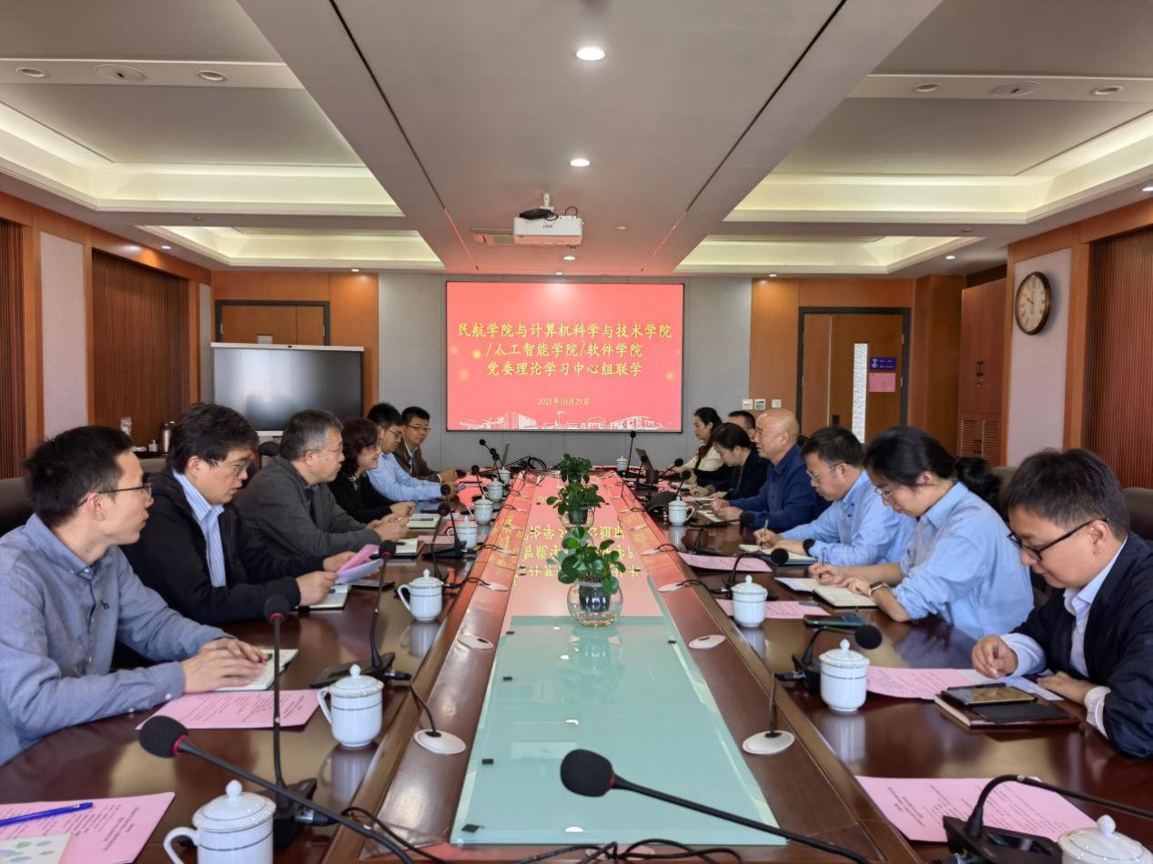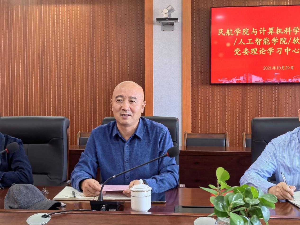 为深入落实校党委党史学习教育工作部署,推动理论学习联系工作实际,促进院级党组织相互学习和交流,10月29日,民航学院党委和77779193永利官网党委理论学习中心组在民航学院1213会议室,围绕“学习习近平总书记给全国高校黄大年式教师团队代表的回信精神”、“学习王泽山、刘永坦等工信楷模的先进事迹”两个专题展开联合学习,并就两学院学科交叉融合发展设想作重点发言。会议由民航学院党委书记刘建成主持,双方党政领导班子全体成员、党委委员、党政办主任参加了学习。