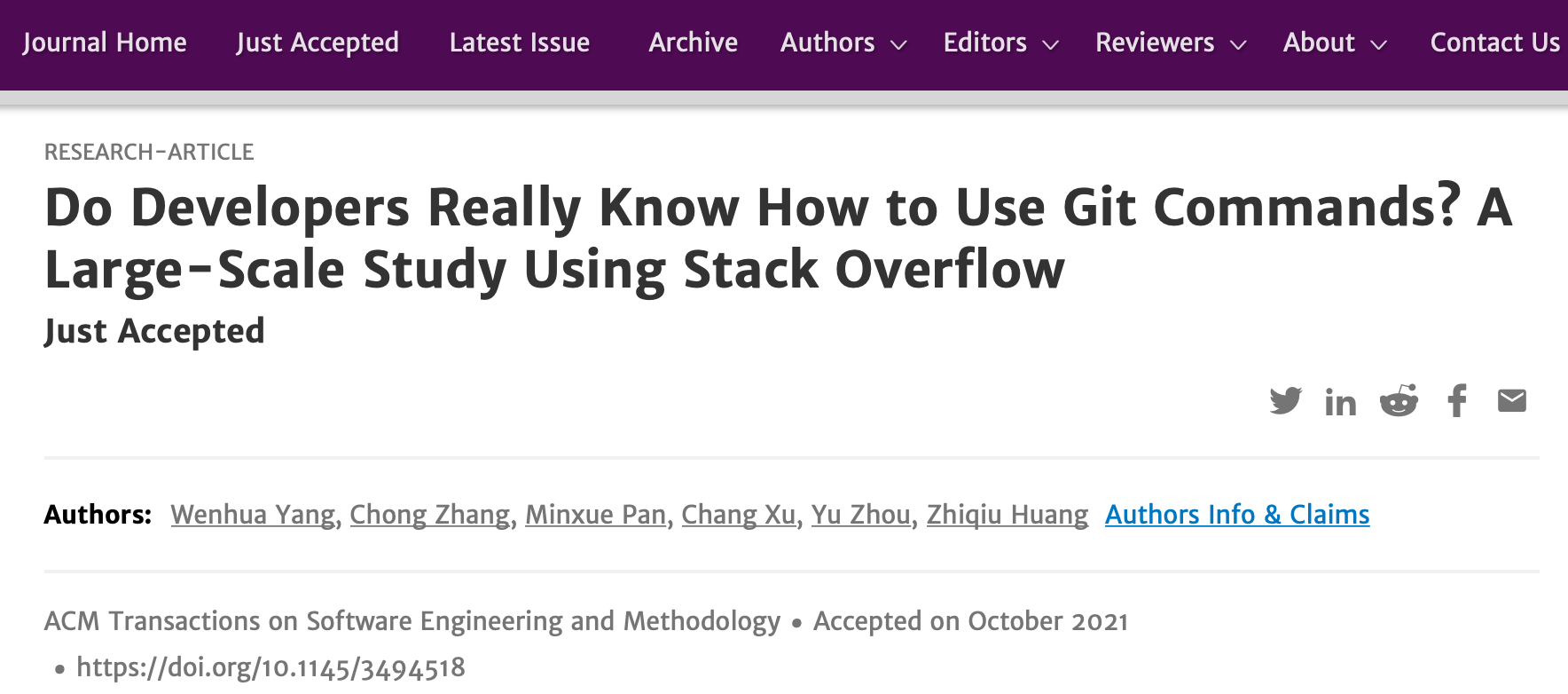 2021年10月,以杨文华老师为第一作者,我校为第一单位的成果《Do Developers Really Know How to Use Git Commands? A Large-Scale Study Using Stack Overflow》被TOSEM录用,这是南京航空航天大学首篇作为第一作者第一单位的成果被TOSEM录用并在线刊出。次月,周宇教授第一作者成果《Adversarial Robustness of Deep Code Comment Generation》被TOSEM录用;近年来,我校软件工程团队不断开拓,在软件工程研究上注重内涵式高质量发展,持续取得重要科研成果。根据TOSEM官网上的数据显示,据统计,我校在TOSEM上发表的论文(含合作)有6篇文章,排在内地高校前茅。